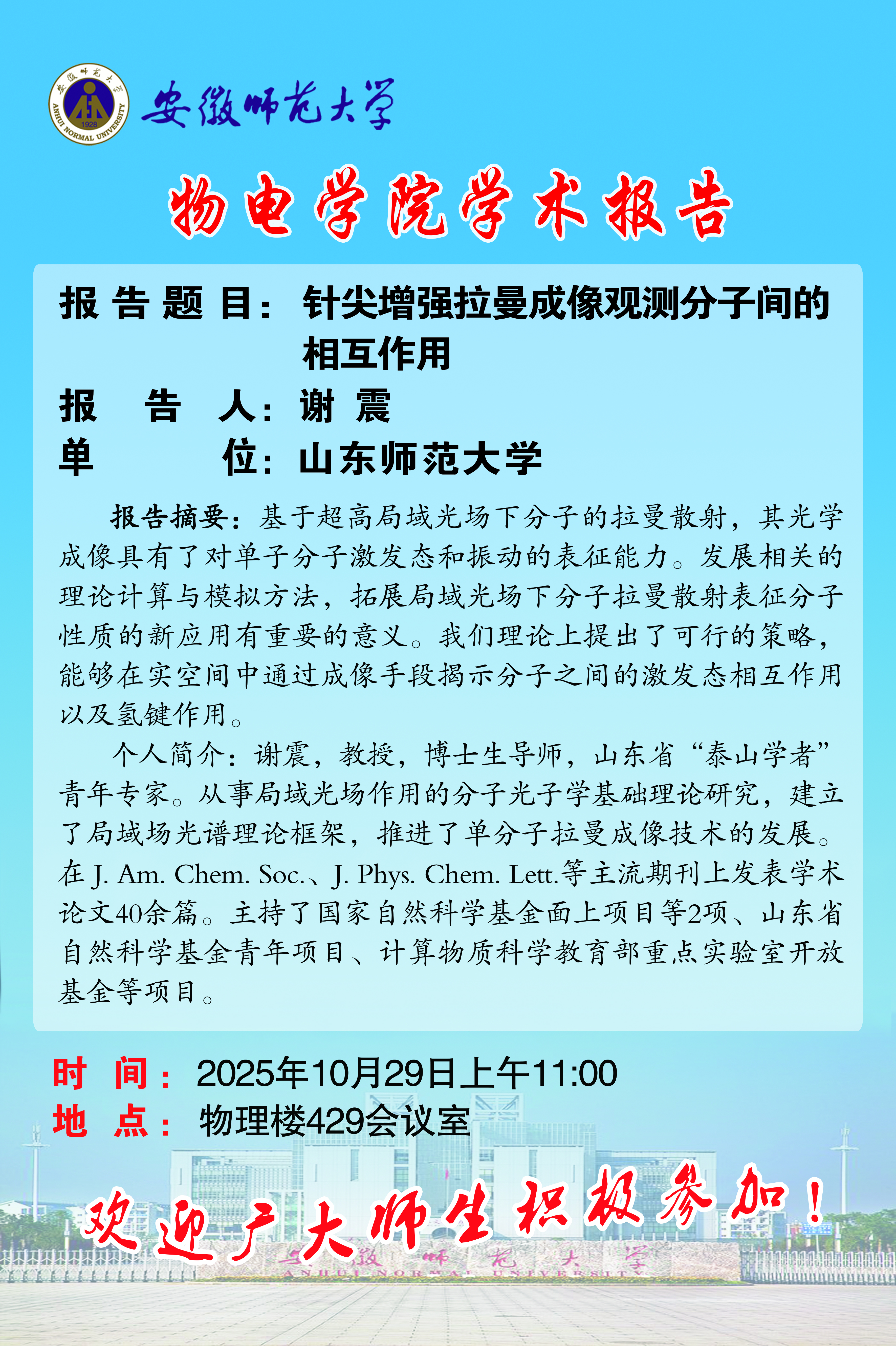 【学术预告】物电讲坛2025年第40期:针尖增强拉曼成像观测分子间的相互作用