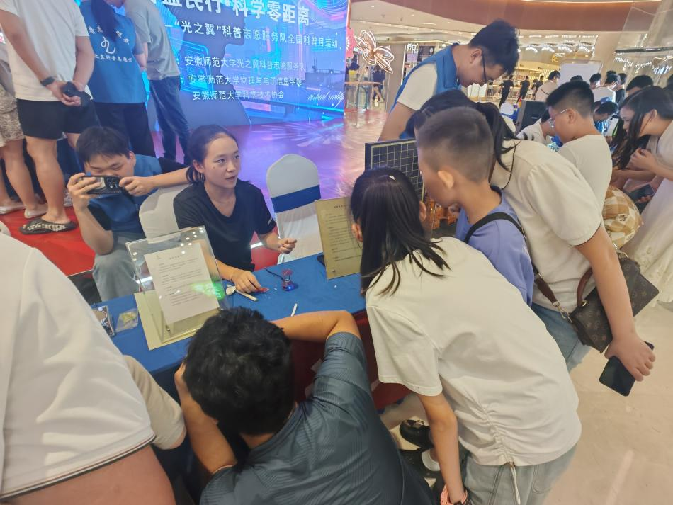 围绕“光、电、声、磁”等基础物理主题,现场设置了3D全息投影、显微探秘、玩转纸牌、电磁悬浮、掌心放电、超声波悬浮、太阳能发电、丁达尔效应等十多个互动体验展台。在3D全息投影前,孩子们透过志愿者自制的“3D投影仪”看到立体的动画,了解了光干涉的神奇魔力。只需要一滴牛奶,就能让激光光束在透明液体中“再现”,小朋友在惊叹声中亲眼见证了什么是“丁达尔效应”。一个纸杯、一个饮料瓶、一支激光笔,简单的材料巧妙地演示了显微镜的原理。在蓄电池演示仪前,双手掌心放置在示意的位置上,就能看到电流的指针偏转,在志愿者耐心地解释下,小朋友们既感受到了科学的乐趣,又学习到了科学知识。此外,安徽师大电子爱好者协会带来的智能车、哨兵机器人等作品,更让观众感受到科技的魅力。邵女士带着两个儿子体验了几个科普作品后表示:“这种边玩边学的方式特别好,孩子们现在不愿意走,还缠着问为什么手上会有电流,这就是科学兴趣。”